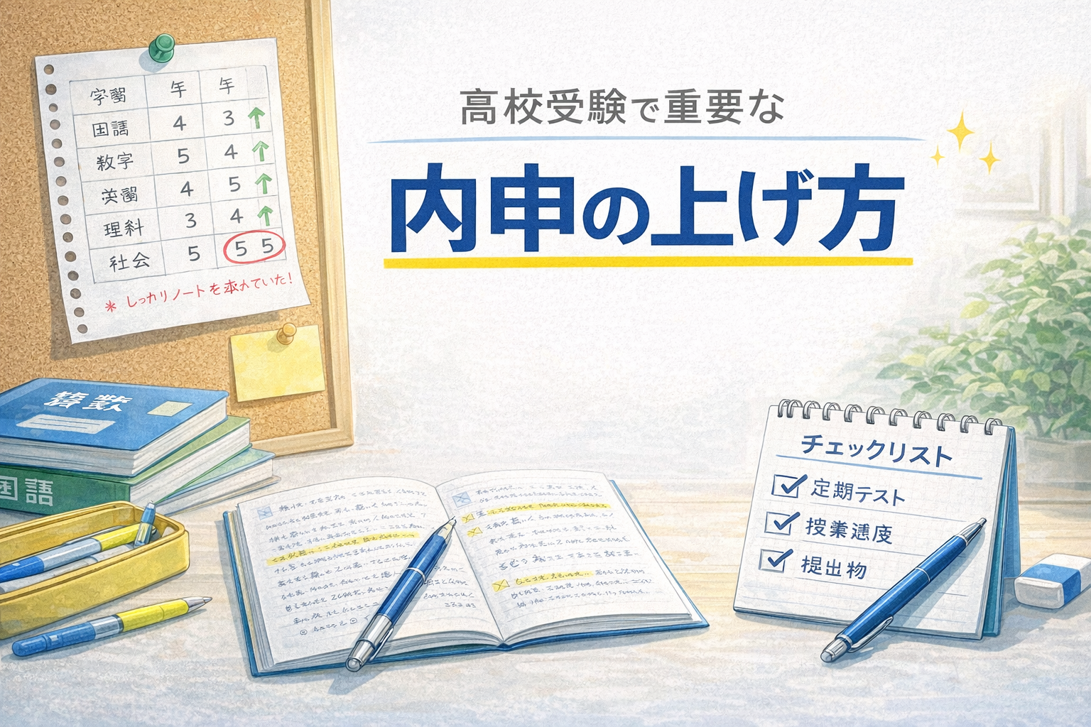高校受験で内申点を上げたい中3生・保護者の方へ。内申点の仕組みと今から取り組める対策を解説。都立・私立の受験戦略にも直結する内申点の考え方を整理します。 -