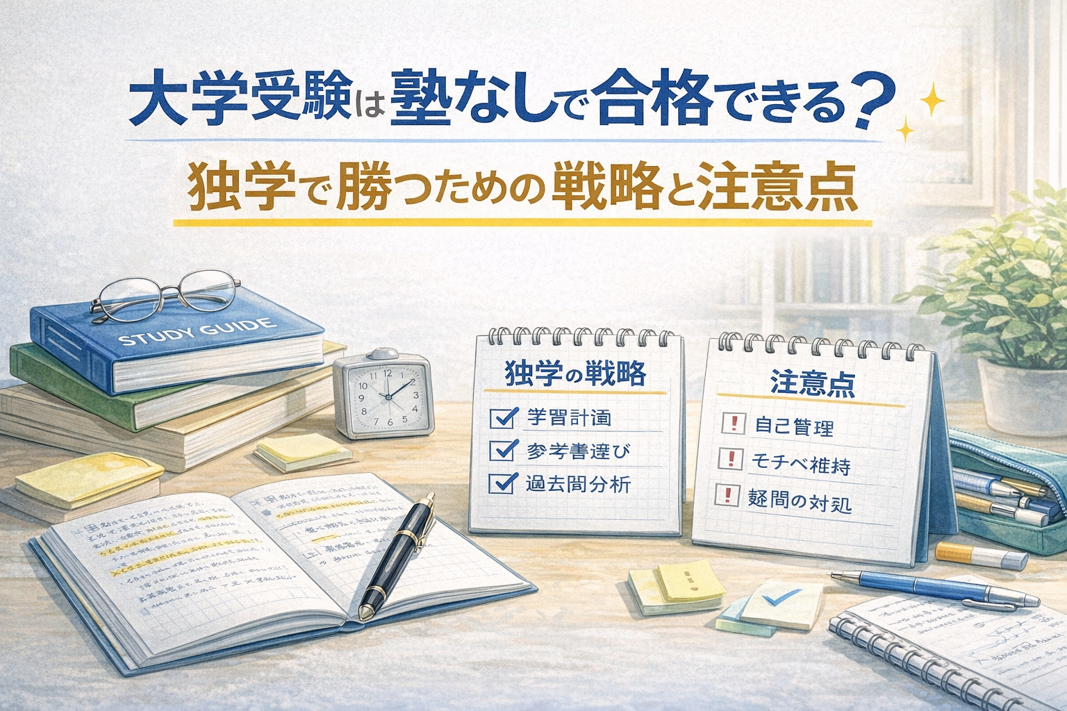 大学受験を塾なしで突破できるか?独学で合格するための勉強法・スケジュール管理・弱点対策まで、戦略的に整理します。 -