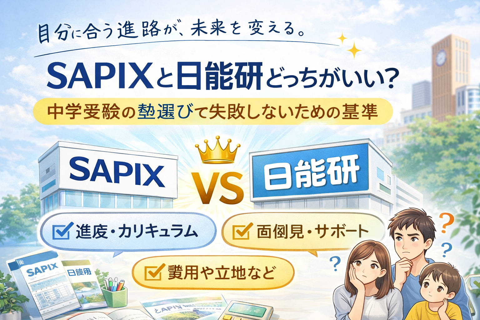 SAPIXと日能研、どちらを選ぶべきか。授業進度・家庭学習の負担・面倒見・志望校との相性など、中学受験で失敗しない塾選びの基準を整理します。 -